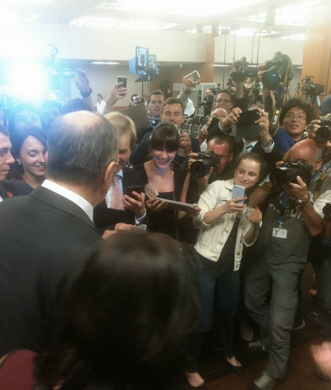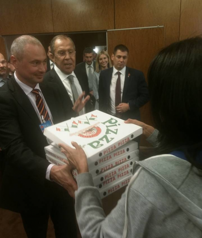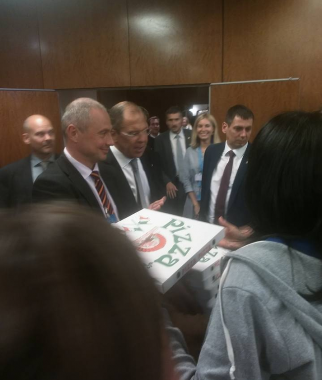 На 15-м часу ожидания итогов переговоров России и США по ситуации в Сирии министр иностранных дел РФ Сергей Лавров принес журналистам пиццу от американской делегации. Министр также пошутил, что водку передала российская сторона.