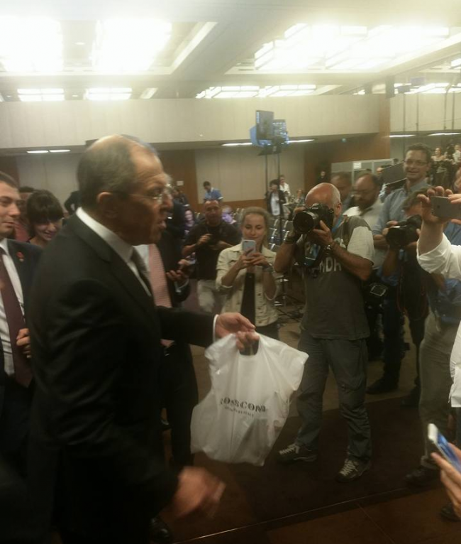 Мария Захарова: Чтобы искупить (ха-ха) затянувшуюся уже на 9 часов паузу , вызванную согласованием американской делегацией хода переговоров с Вашингтоном, Керри прислал Лаврову и его команде пиццу. Лавров отнес ее журналистам. Журналисты (не наши) попросили к ней водку. Лаврова долго просить не пришлось - с собой было. "Пицца от американцев, водка от нас", - сказал Лавров, передавая продпаёк.