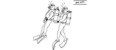 За положением маски и легочного автомата. Если жертва дышит, неплохо бы одновременно поддерживать легочник у него во рту. Другой рукой спасатель берет инфлятор потерпевшего и надувает его КП воздухом (рис. 4.69). При неисправности компенсатора иногда приходится сбрасывать грузовые пояса и надувать собственный КП или костюм (рис. 4.70), а в крайнем случае — подниматься на ластах, и тогда удобнее держать жертву за баллон со спины, удерживая ее в устойчивом вертикальном положении (рис. 4.71).