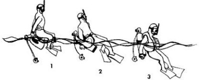 Положение 4. Акваланг с надутым жилетом—компенсатором привязывают к судну концом. Подводник бросает его в воду, затем прыгает сам в комплекте №1. Подплыв к снаряжению, отвязывает и надевает. Очень удобный метод, позволяющий не напрягаться и не пыхтеть под тяжестью акваланга на палубе, но возможный только в штиль.