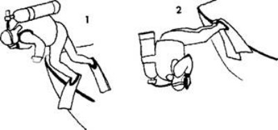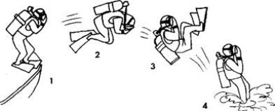 Положение 1, самое обычное. Подводник стоит на палубе (пирсе, платформе, скале) и прыгает вниз "солдатиком", делая большой шаг вперед — прямо или с небольшим поворотом в воздухе. Ноги сводить вместе не стоит, так как большая площадь обеих ласт усиливает удар о воду и не позволяет нормально погрузиться (фото 4.3 и 4.4).
