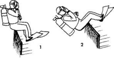 С палубы корабля можно спуститься по трапу, что весьма неудобно делать в ластах, или прыгнуть разными способами — в зависимости от исходного положения и высоты борта (берега, пирса, платформы, скалы).