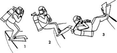 Положение 2. Подводник стоит на палубе спиной к морю на полусогнутых ногах, делает полукувырок назад, падая в воду спиной, оставляя ноги полусогнутыми, а туловище — переломленным в поясе (фото 4.5).