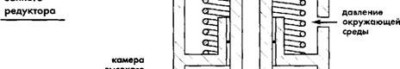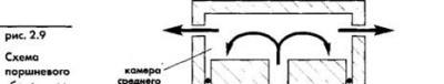 1. Введение дополнительной поверхности поршня. Такое решение, как правило, используется в мембранных редукторах. Вернемся к схеме такового (рис. 2.7). Высокое давление действует на тарелку клапана в двух направлениях — на открытие и на закрытие клапана. Вторая сила при этом превышает первую, так как развивается за счет давления на большую площадь. Это означает, что чем ниже высокое давление, тем выше должно быть промежуточное, достаточное для закрытия клапана. Изменив форму поршня так, как показано на рис. 2.8, можно выровнять площади поверхностей, подвергающиеся воздействию высокого давления в сторону открытия и закрытия клапана. "Лишняя" поверхность при этом выносится в дополнительную камеру, заполненную воздухом среднего давления.