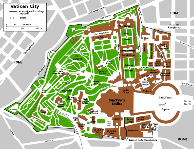 В Риме и его окрестностях Ватикану принадлежат три собора (Санта Мария Маджоре, Сан-Джованни ин Латерано и Сан-Паоло), ряд дворцов и вилл общей площадью 0,7 кв.км. Вблизи Рима в замке Кастель-Гандольфо находится летняя загородная резиденция папы. Ватикан не имеет своего постоянного населения. На его территории проживает папа, руководители римской курии, служащие ватиканских учреждений.