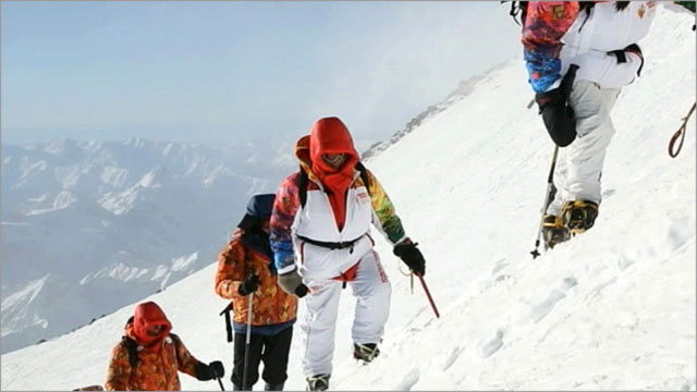 Эльбруса на высоте 5642 метра над уровнем моря Чашу Олимпийского Огня зажгли Абдул-Халим Эльмезов и Карина Мезова.