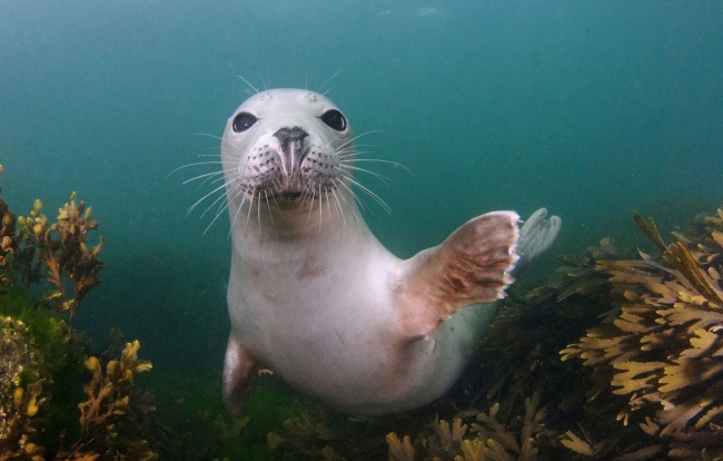 SCUBA Diver Jason Neilus gets up close and personal with friendly seals in the Farne Islands, UK.