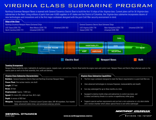 «Продолжая строить два корабля в год, ВМФ и команда промышленников сохраняют стабильность, обеспечивая флот подводными лодками, необходимыми для поддержания господства США на море», – добавил Джеффри Гейгер, президент второй компании-подрядчика General Dynamics Electric Boat.