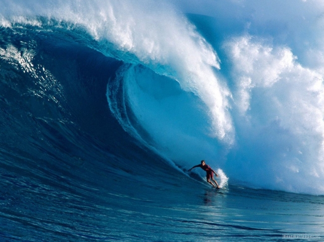 Серфер Гаррет МакНамара путешествует по миру в поисках больших волн, чтобы покорить их. В Португалии ему случайно попалась волна высотой 90 футов (27,5 метров), которую он оседлал".
