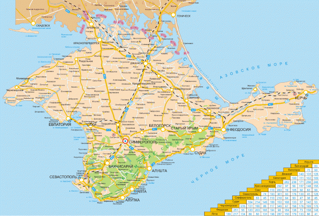Подробная туристическая карта Крыма с указанием расстояний между городами. Карта автомобильных дорог Крыма.