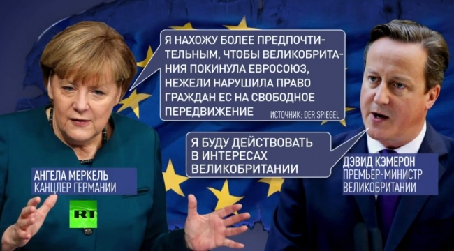 RT на русском Берлин скорее согласится с выходом Великобритании из ЕС, нежели поступится основными принципами Евросоюза. Как сообщает немецкий журнал Der Spiegel, именно это канцлер Германии Ангела Меркель сказала премьер-министру Великобритании Дэвиду Кэмерону.