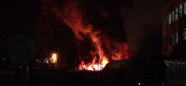 Горят склады, рядом с парком Пушкина, киностудии им. Довженко и станции метро "Шулявская", все покрыто черным дымом, видно пламя.