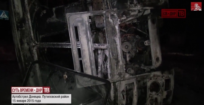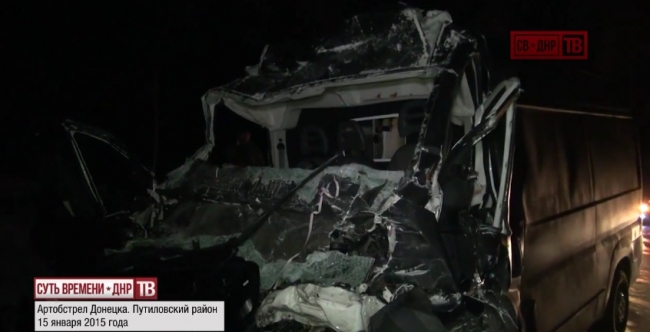 Обстрел Донецка вечер 15.01.2015. В результате массированных артобстрелов киевской хунтой Донецка, среди мирного населения большое количество жертв. 15 января под артобстрел попал пассажирский автобус и автомобиль с ополченцами.