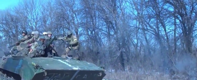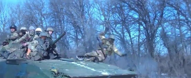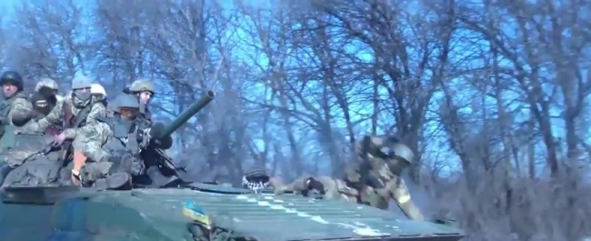Украинский солдат упал с БМП во время отступления. Во время отступления из Дебальцева измождённый украинский солдат свалился с БМП-1, ехавшей на полном ходу