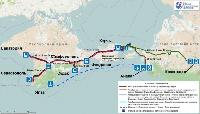 Туристы сначала будут ехать поездом до Анапы, а далее связка автобус-паром-автобус до Феодосии, Судака, Симферополя, Севастополя и Евпатории. Такая же связка будет действовать от Краснодара до Керчи.