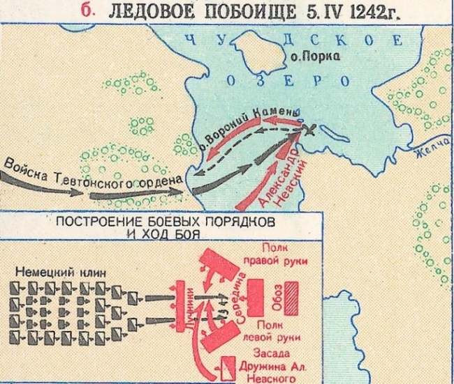 Битва на Чудском озере, вошедшая в историю под названием Ледовое побоище, началась утром 5 апреля 1242 года. На восходе солнца, заметив небольшой отряд русских стрелков, рыцарская "свинья" устремилась на него. Немецкому клину Александр противопоставил русский пяток – строй в виде римской цифры "V", то есть угла, обращённого отверстием к противнику. Это самое отверстие прикрывали "чело", состоявшее из лучников, которые-то и приняли на себя основной удар "железного полка" и мужественным сопротивлением заметно расстроили его продвижение. Всё-таки рыцарям удалось прорвать оборонительные порядки русского "чела". Завязалась ожесточенная рукопашная схватка. И в самый ее разгар, когда "свинья" полностью втянулась в бой, по сигналу Александра Невского по ее флангам во всю мощь ударили полки левой и правой руки. Не ожидавшие появления такого подкрепления русских, рыцари пришли в замешательство и под их мощными ударами стали понемногу отступать. А вскоре это отступление приняло характер беспорядочного бегства. Тут внезапно из-за укрытия в бой кинулся конный засадный полк. Ливонские войска потерпели сокрушительное поражение.