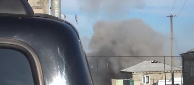 Авиаудар по позициям боевиков вблизи поселка Мааррет-эн-Нууман. Авиаудар бомбардировщиков Су-24 по позициям боевиков на въезде в населенный пункт Мааррет-эн-Нууман. На видеосъемке зафиксировано попадание авиабомб в укрытия боевиков на блокпосте и их
