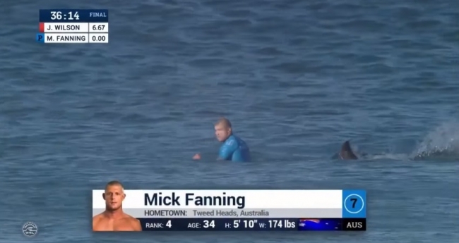 Нападение акулы на сёрфингиста Мика Фэннинга. Серфингист подрался с напавшей на него акулой. Во время соревнований в Южной Африке на австралийского 34-летнего сёрфингиста Мика Фэннинга напала акула. Ему удалось от нее отбиться, причем буквально. Спортсмен бил рыбу кулаком и ногами. Он не пострадал, однако из-за инцидента турнир прервали на день.